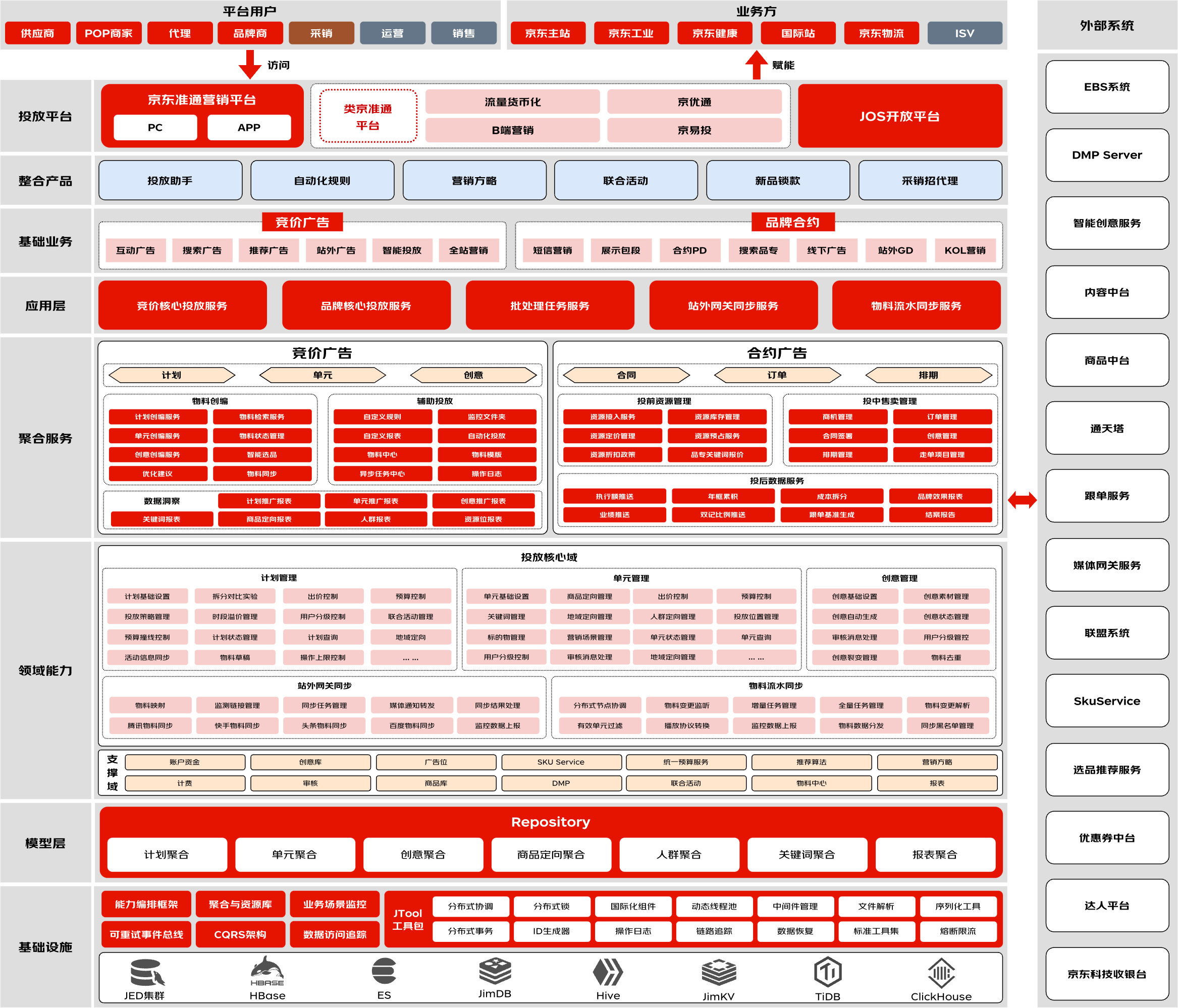 与高并发请求给C端系统带来的系统高性能、高可用能力挑战相比,B端系统所面临的挑战则是如何在海量多维度、多模块、多场景融合的复杂业务需求中保持系统健康、稳定、快速地迭代。京东广告投放平台就是一个典型的复杂B端业务系统,它承担着集成广告业务体系中各个垂直业务模块,构建、维护和分发广告物料的重要职责。经过多年迭代,京东广告投放系统目前已集成40余个垂直业务系统,支撑7条核心产品线,先后赋能10余个独立投放平台,维护着一个拥有200余个业务实体的庞大数据模型,每天都需要处理海量长事务、多系统交互的复杂业务请求。同时作为整个广告业务链路上的首发环节和功能门面,广告投放系统每年都要承接400余个来自不同业务方的差异化需求、执行1000余次代码合并及600余次功能发布。在极高的需求密度之下,作为撬动广告主预算的重要战场,投放系统在为广告主提供优秀投放体验的同时,还需要每天向广告业务链路稳定输送PB级的物料数据,这对系统的性能、稳定性以及团队的研发效能提出了极高的要求。