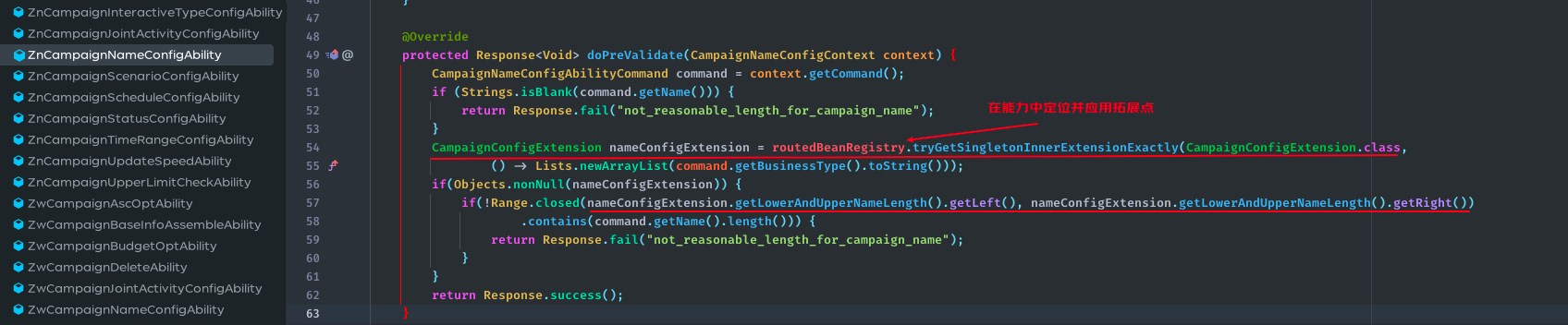 上面的例子是在计划名称设置能力中获取不同产品线计划名称长度上下限配置的拓展点,计划名称设置能力自身按照产品线类型进行业务模式路由,但是站内计划名称设置主要业务逻辑基本一致,仅在部分校验逻辑上不同产品线有各自的要求,此时就可以使用一个名称设置能力实例服务所有的站内产品线,定义名称设置主体业务规则,而把不同产品线的细微差异抽象成一个拓展点接口。