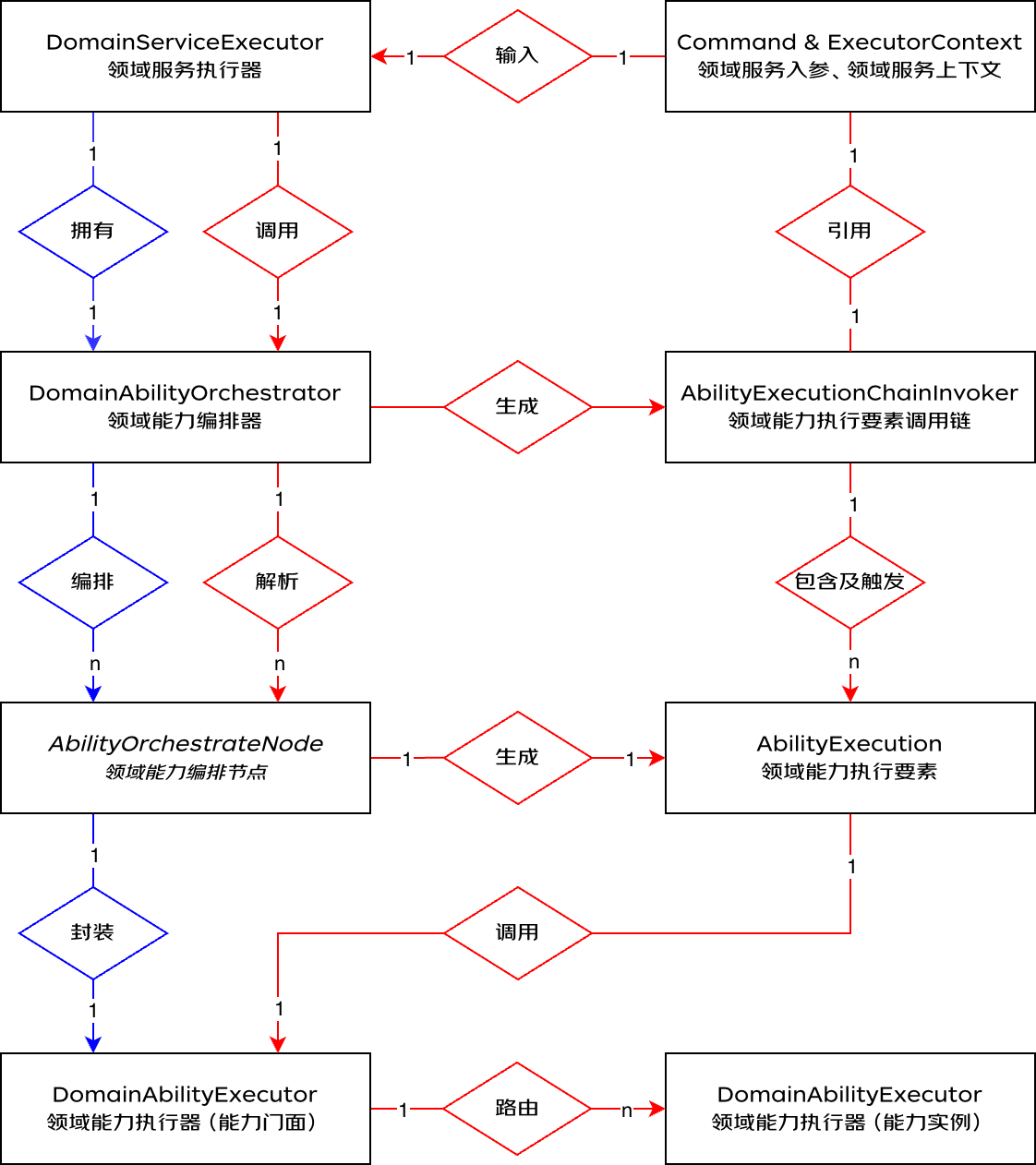 PICASO能力编排框架的核心职责有两个,首先是在编码阶段让开发者能够以易用、简洁、直白的方式快速定义出业务流程对应的领域能力执行图,其次是在请求处理阶段将能力执行图解析为可以被标准模版执行引擎理解的执行计划,让其能够根据开发者意图完成业务逻辑的处理。我们可以通过下图所示的框架内部实体关系图对上述两项职责进行详细阐述,图中蓝色线条标记的是领域能力执行图的构建过程,红色线条标记的是请求到来时领域能力执行图的执行流程。