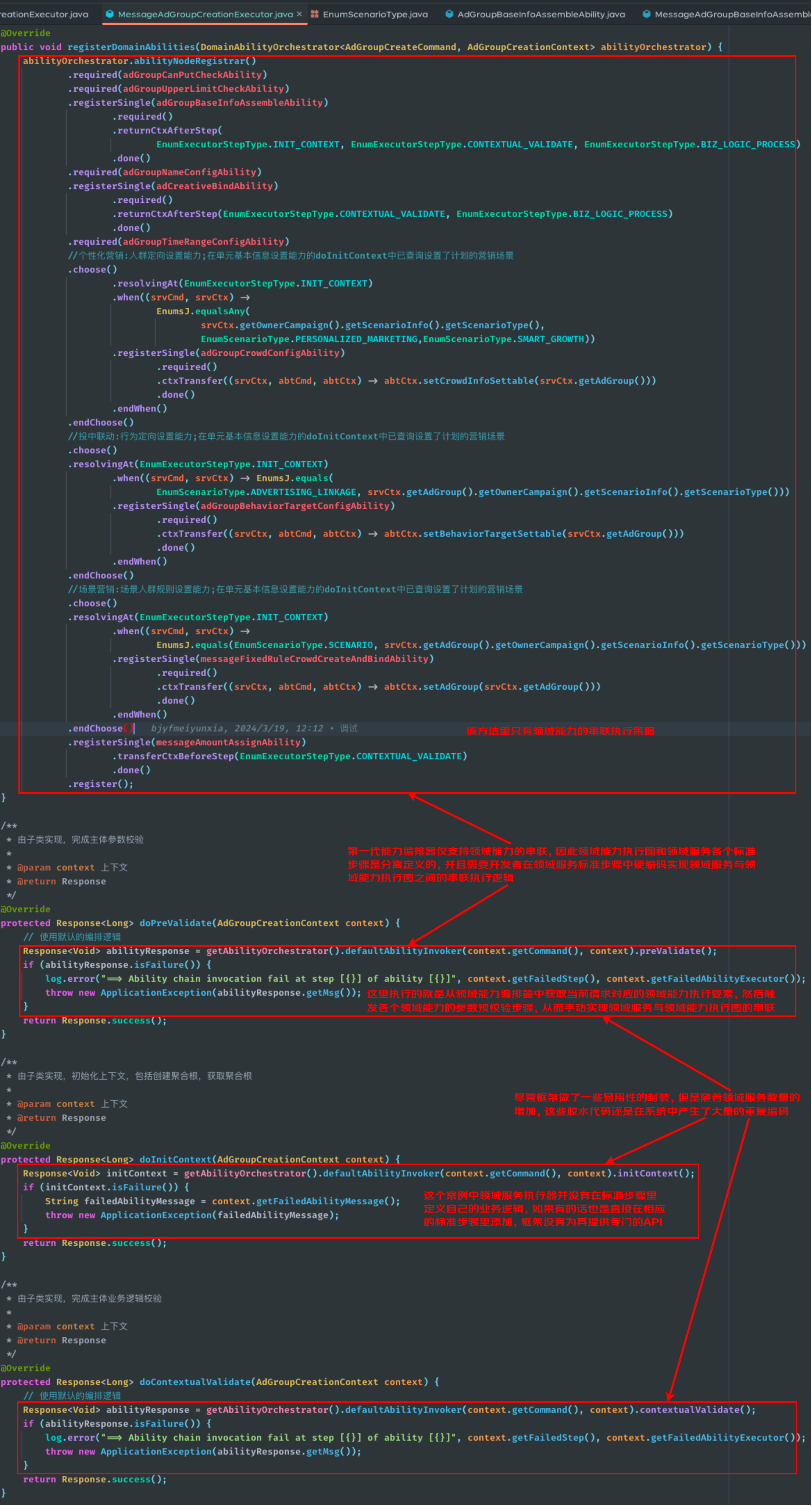 截止到目前,PICASO领域能力编排框架已经经历了两轮功能迭代,前文所述的顺序、条件及循环编排是第一代能力编排框架提供的特性,这一代能力编排框架仅支持领域能力之间编排串联,而领域服务各个标准步骤内的业务逻辑和能力执行图之间的串联依然需要手动硬编码实现。下图给出了一个使用第一代能力编排框架的领域服务案例,这个案例也清晰地呈现了领域能力执行图与领域服务各个标准步骤之间的关系。可以看到领域服务执行器提供了一个标准的领域能力编排入口registerDomainAbilities,该模板方法通过参数提供了一个领域能力编排器(DomainAbilityOrchestrator),开发者可以通过该模板方法完成领域能力执行图的构建。然而当请求到来时,标准业务模版执行引擎并不会直接触发领域能力执行图的调用,它仅会按照标准业务执行流程依次调用领域服务执行器的各个标准步骤,而领域能力执行图的调用则必须由开发者硬编码到领域服务执行器的各个标准步骤中。当然框架已经将领域能力执行图的触发逻辑封装成了相对易用的API(详见下面截图中doPreValidate方法中被标注的代码片段),因此这种设计的实现成本不算太高。但是随着系统中领域服务执行器数量的增长,它也的确在系统中引入了大量重复的胶水代码,并且造成了领域服务中业务逻辑与领域能力值执行图之间的割裂,无法提供彻底的连贯开发体验。