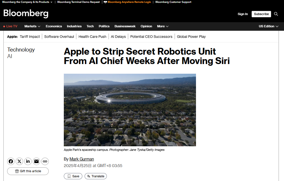 彭博社援引知情人士消息称,苹果计划本月晚些时候将机器人团队从约翰・贾南德雷亚(John Giannandrea)的人工智能部门迁至硬件部门,这将使该团队由负责硬件工程的高级副总裁约翰·特努斯(John Ternus)领导。这是该公司为应对人工智能困境而做出的最新举措。