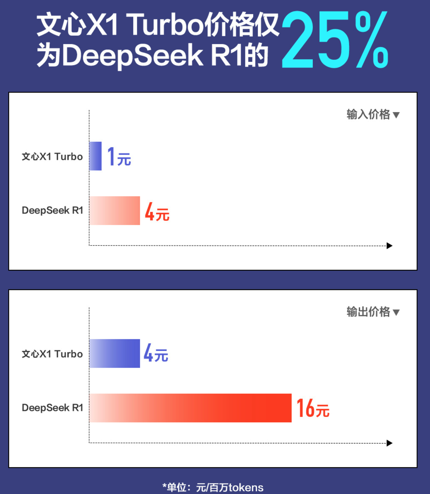 文心大模型 X1 Turbo 价格较上一代下降 50%,仅为 DeepSeek R1 模型的 25%。