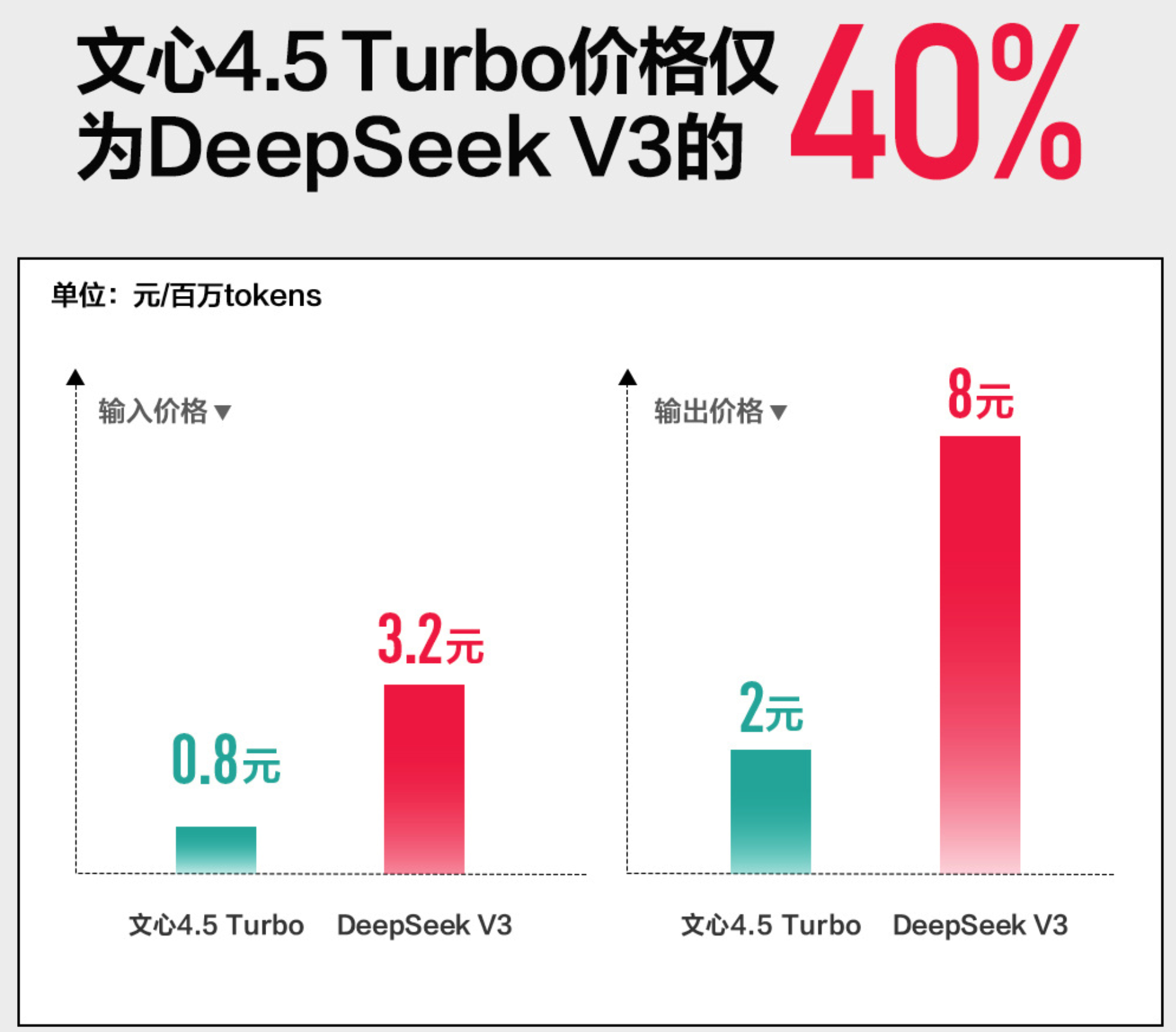 据介绍,文心大模型 4.5 Turbo 价格相比文心 4.5 下降 80%,仅为 DeepSeek V3 调用价格的 40%。