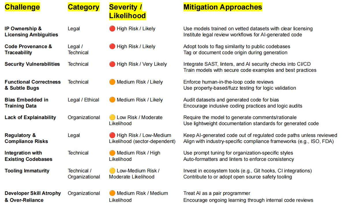 事实上,人工智能生成代码还面临许多其他的挑战,例如缺乏解释能力,与现有代码库的整合,过度依赖人工智能工具等等。Ibrahim Haddad 博士指出,必须系统性地构建应对机制以化解这些风险,方能最大化地发挥技术工具的价值。