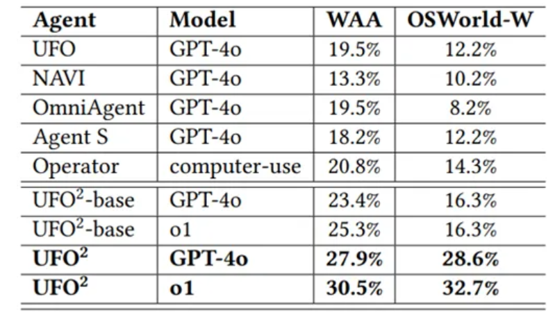 通过测试数据显示,UFO² 在自动化任务的成功率方面,显著高于 OpenAI 的 Operator。在不同的测试场景中,UFO² 的成功率分别达到了30.5% 和32.7%,而 Operator 的成功率仅为20.8% 和14.3%。此外,UFO² 在处理复杂任务和跨应用操作的表现上也明显优于 Operator,其在非标准界面的适应性更强。