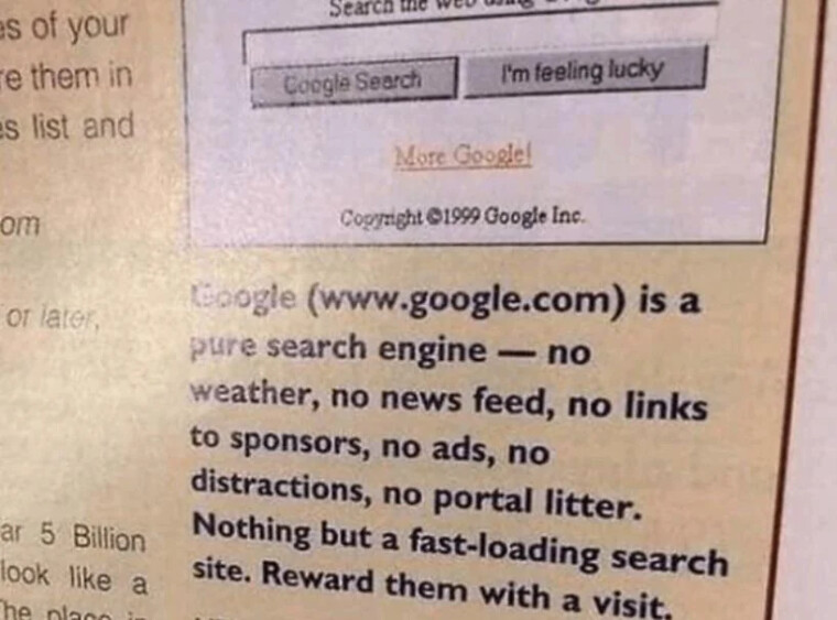 早在1999年,Google就被誉为“纯粹的搜索引擎”,承诺提供简洁、无广告的体验,没有“门户垃圾”,这与当时那些杂乱无章的搜索网站截然不同(见下图)。