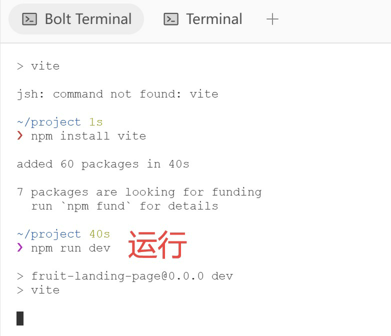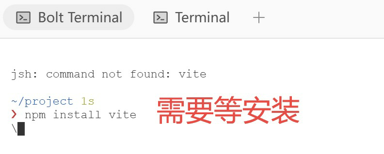 在完成编码后进⾏运⾏,但是运⾏的时候需要对环境进⾏初始化操作,补充⼀些环境内容,这⾥就可以看到,需要先进⾏vite安装操作。