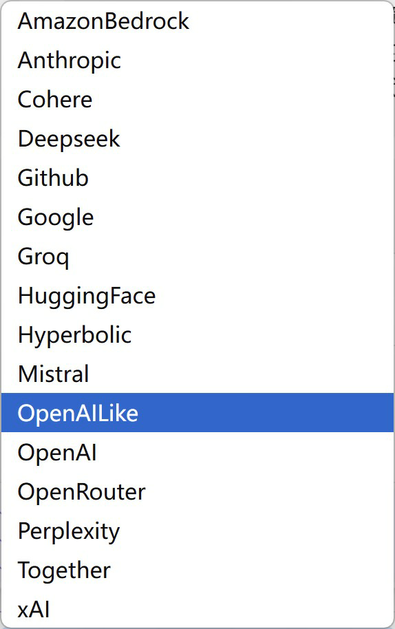 可选的平台还是⾮常多的,默认的是openAILike,也就是百炼⼤模型的选项,还有很多国内外知名的平台,很全⾯,Deepseek的也是可以直接输⼊API Key直接进⾏访问的。