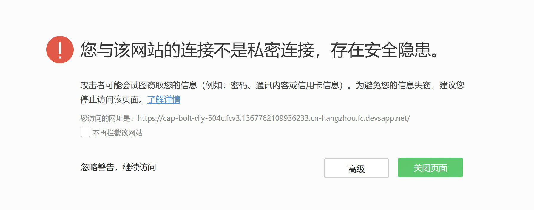 访问后的效果,这⾥需要点击【忽略警告,继续访问】,但是要分浏览器,我这⾥的提示是360的 浏览器,如果使⽤⾕歌等其它浏览器需要点击⼀下【⾼级->继续访问】才可以正常的访问,因为默 认给的是https服务,⼤家都知道https是有验证的,咱们⾃⼰⼀般使⽤的是http访问这个验证就简单了,所以这⾥需要点击忽略。