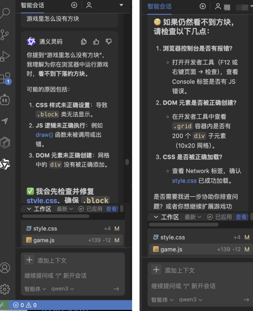 同样在智能问答模式下,它只能生成代码,无法直接创建应用。切换智能体模式,让它帮我创建一个俄罗斯方块游戏,前面还很顺利,跳转到游戏页面,没有方块。报给通义之后,它进行了两轮自动检查修复,还是没成,接下来需要手动修复问题。(博主到这里就放弃了,欢迎各位开发 er 们投稿晒一晒你们使用各种 AI 编程工具的成功 or 失败的案例,有奖互动)