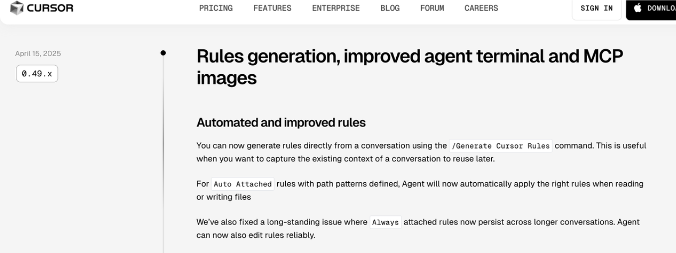 Cursor 在去年底上线了 Agent 版本,今年 4 月新版本中已经支持直接从对话生成规则/Generate Cursor Rules。Cursor Rules 用于自定义 AI 在 Cursor 中的行为,可以视为对大型语言模型(LLM)的指令或系统提示,也就是面向 Cursor 的“提示词”。