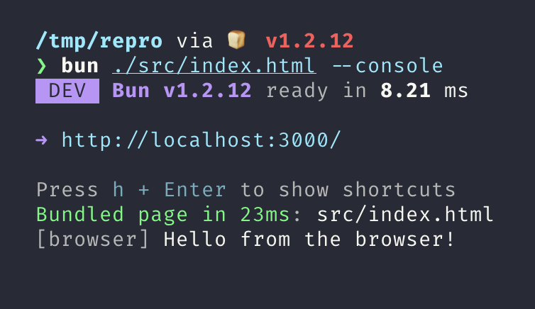 此版本为bun ./index.html新增了--consoleflag,用于将浏览器控制台日志流式传输到终端。