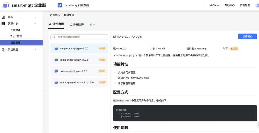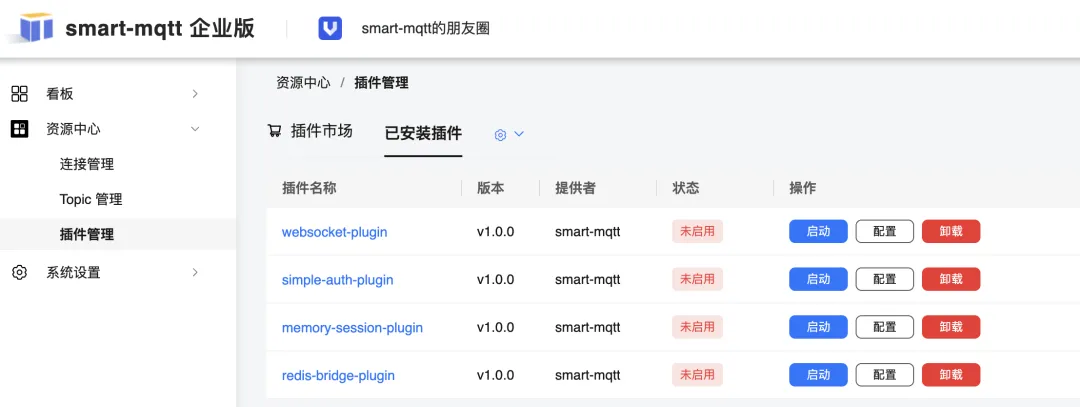 为了满足不同客户在认证、消息桥接、协议适配等方面的个性化需求,v1.1.0 版本正式引入插件化运行环境,允许通过启用/卸载插件的方式,动态扩展 broker 的功能模块。