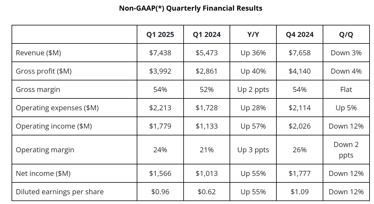 按非美国通用会计准则计算,毛利率为54%,运营收入为18亿美元,净收入为16亿美元,稀释每股收益为0.96美元。