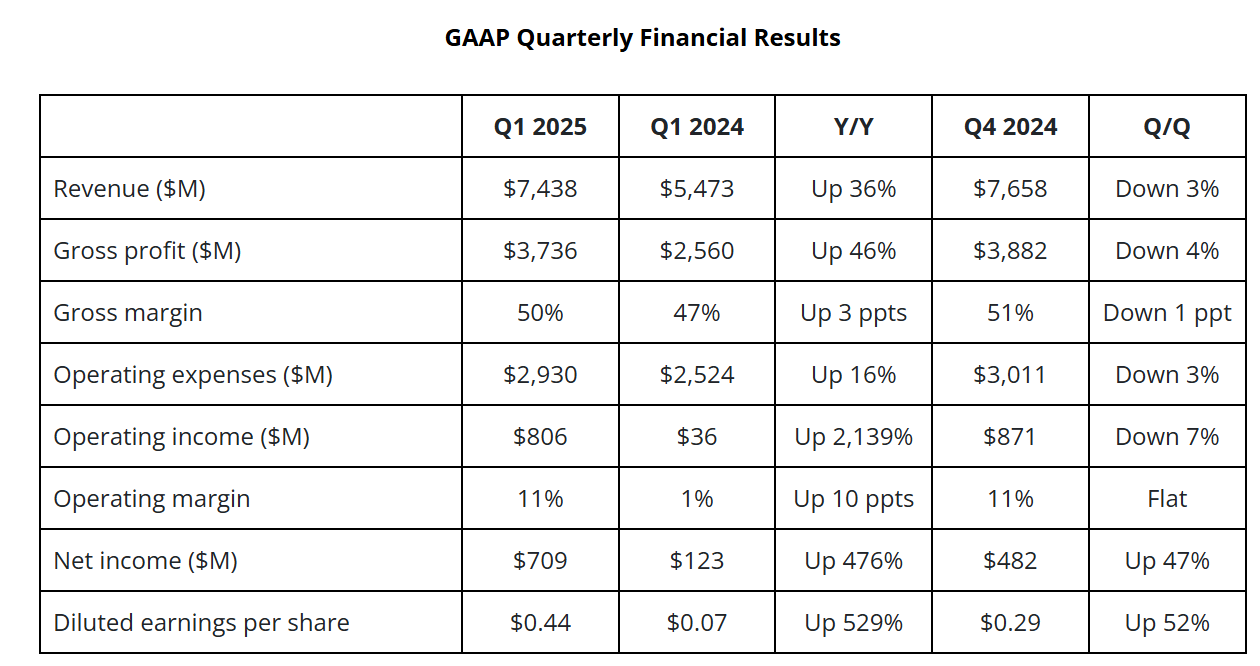 AMD 已发布 2025 年第一季度财报。数据显示,本季度公司实现营收为74亿美元,毛利率为50%,运营收入为8.06亿美元,净收入为7.09亿美元,稀释每股收益为0.44美元。