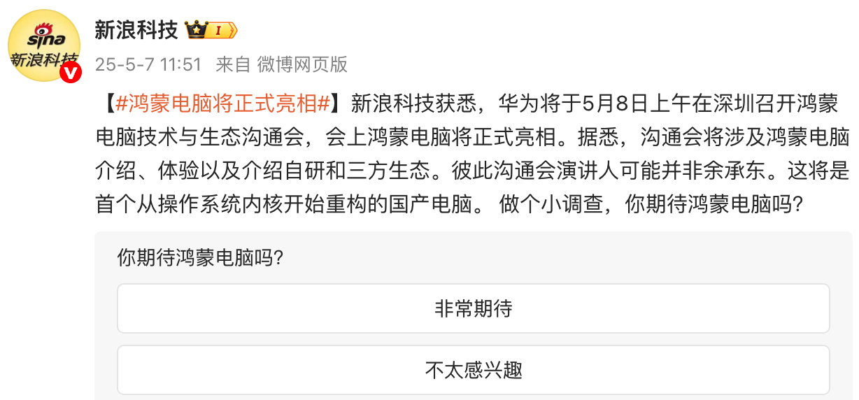 新浪科技报道称,华为将于 5 月 8 日上午在深圳召开鸿蒙电脑技术与生态沟通会,会上鸿蒙电脑将正式亮相。