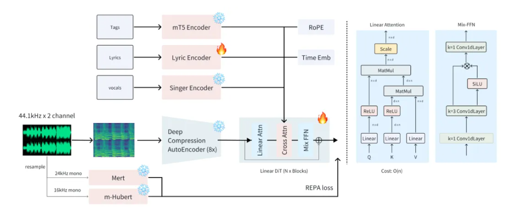 - ControlNet 微调(人声驱动伴奏生成):结合 ControlNet 技术,ACE-Step 能根据输入的旋律或人声自动生成相匹配的伴奏,提升音乐创作的个性化和灵活性。
