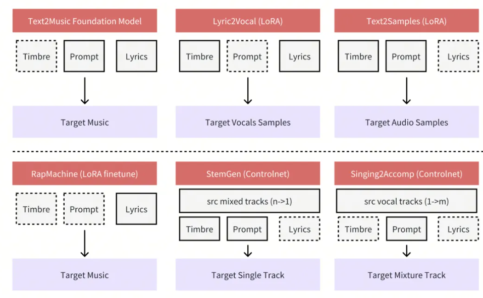 作为一个通用性强的音乐基础模型,ACE-Step 支持包括 LoRA 和 ControlNet 在内的多种微调方式,可灵活适配音频编辑、人声合成、伴奏生成、声线克隆、风格迁移等多种下游任务,极大降低音乐 AI 应用的开发门槛。借助这些能力,ACE-Step 有望推动音乐生成领域迈向自己的 “Stable Diffusion 时刻”。