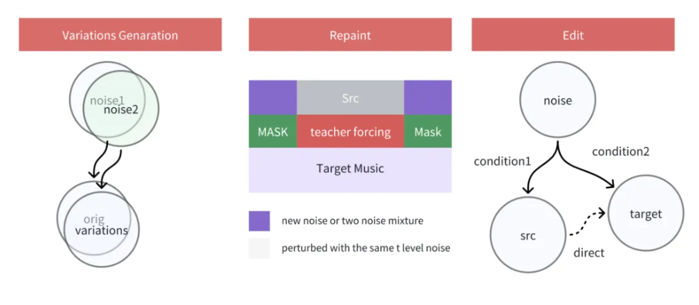 公告称,ACE-Step 不仅仅是一个“生成器”,它还是一个全能的“编辑器”,在创作过程中提供高度的可控性。它为创作者提供了两个关键功能:Edit 和 Retake/Repaint,使得创作过程既精确又灵活。