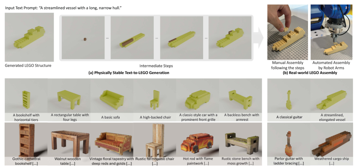 LegoGPT 以端到端的方式根据用户提供的文本提示生成乐高结构。值得一提的是,生成的乐高结构物理上稳定且可搭建。