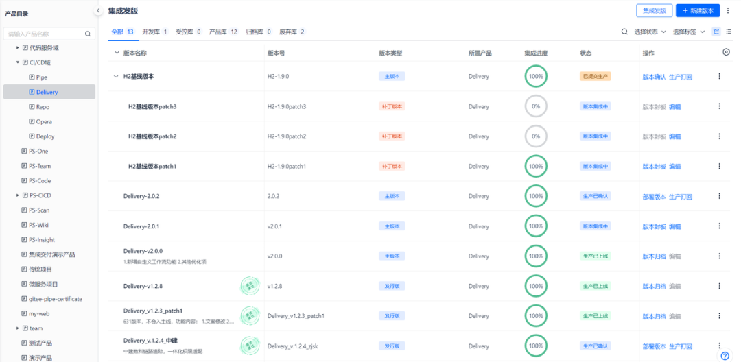 Gitee DevSecOps 软件工厂提供面向组织架构和产品层级的基线版本管理能力,支持构建产品目录并以版本视图呈现产品演进过程,助力团队把控研发进度与成果。