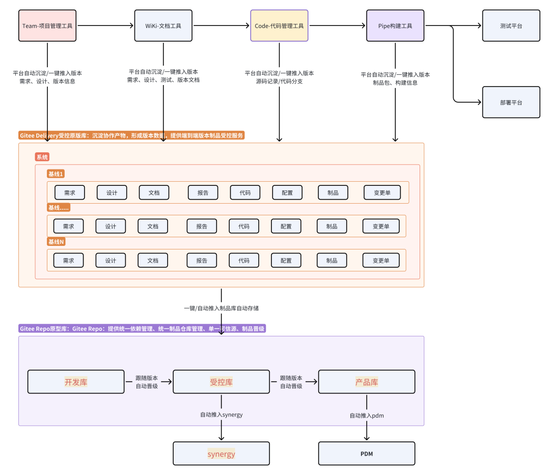 在基线版本中集中管理功能清单、文档、代码与制品等核心资产,并归档至制品库,提升交付效率与版本稳定性。