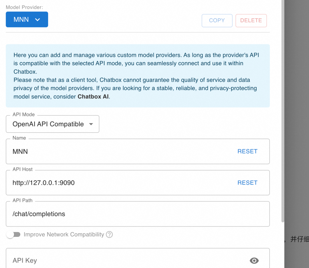 如果喜欢 三方客户端,例如 Chatbox 、LobeChat 等,也可以按照三方客户端配置教程配置。以Chatbox 为例,新建模型配置,填写服务器地址,并且设置 API PATH 为/chat/completions。
