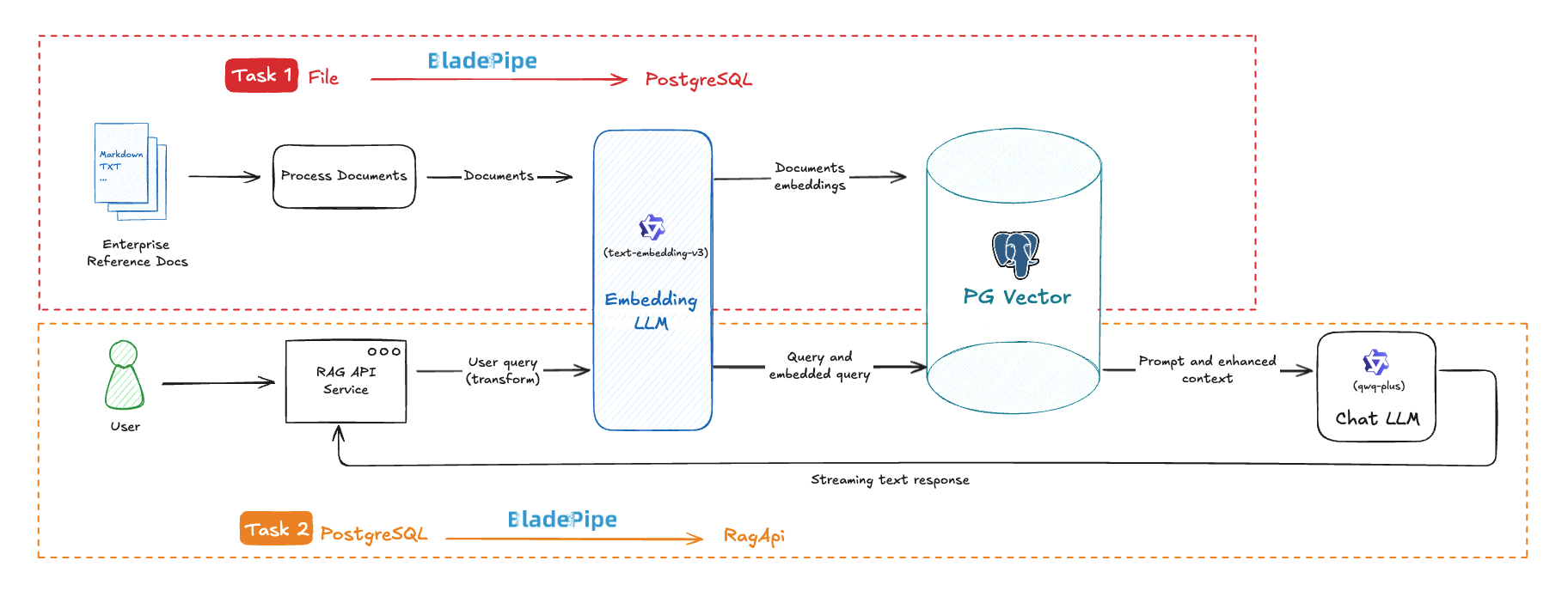 CloudCanal 构建的 RagApi 对外暴露为 OpenAI 格式的 API 接口,可直接对接业务系统或调用方。整体流程分为两个阶段: