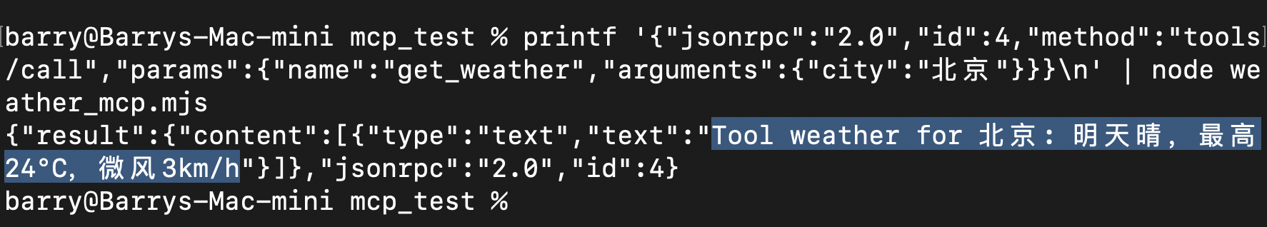 - 生成调用指令:输出包含一次对 get_weather 的 tool_call,并传入所需参数 "我明天要去北京旅游,请帮我查天气"