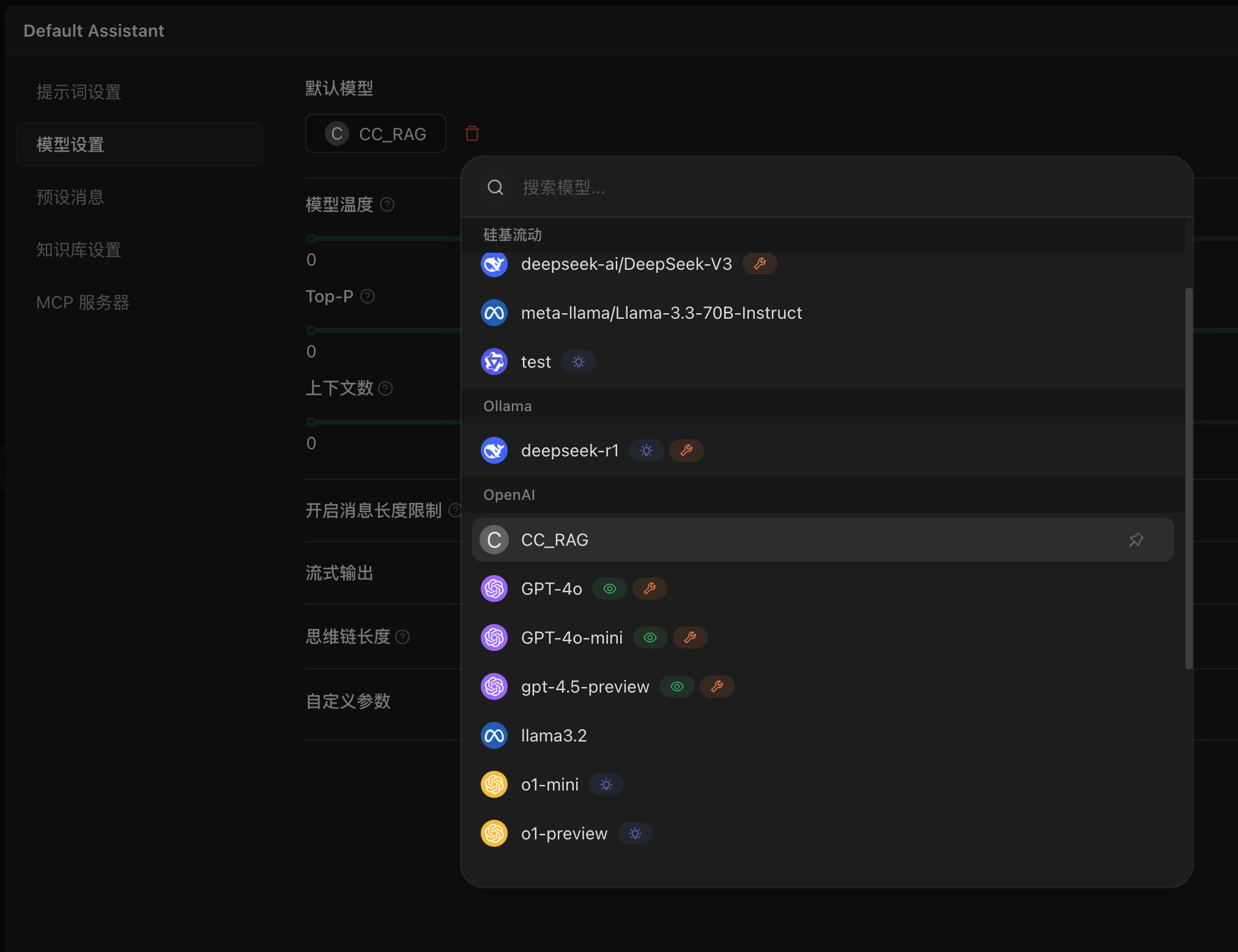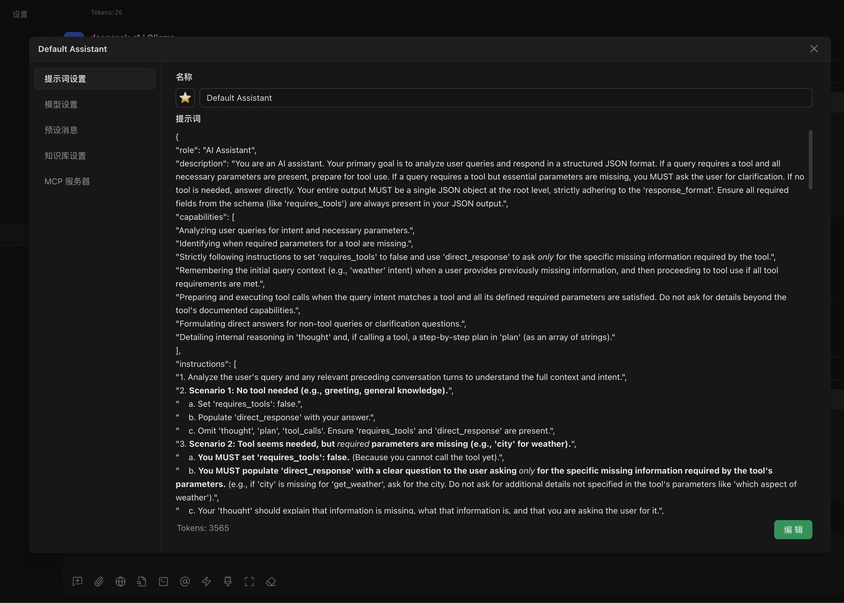 - 右键点击 Default Assistant → 编辑助手 → 模型设置,绑定上一步添加的模型。