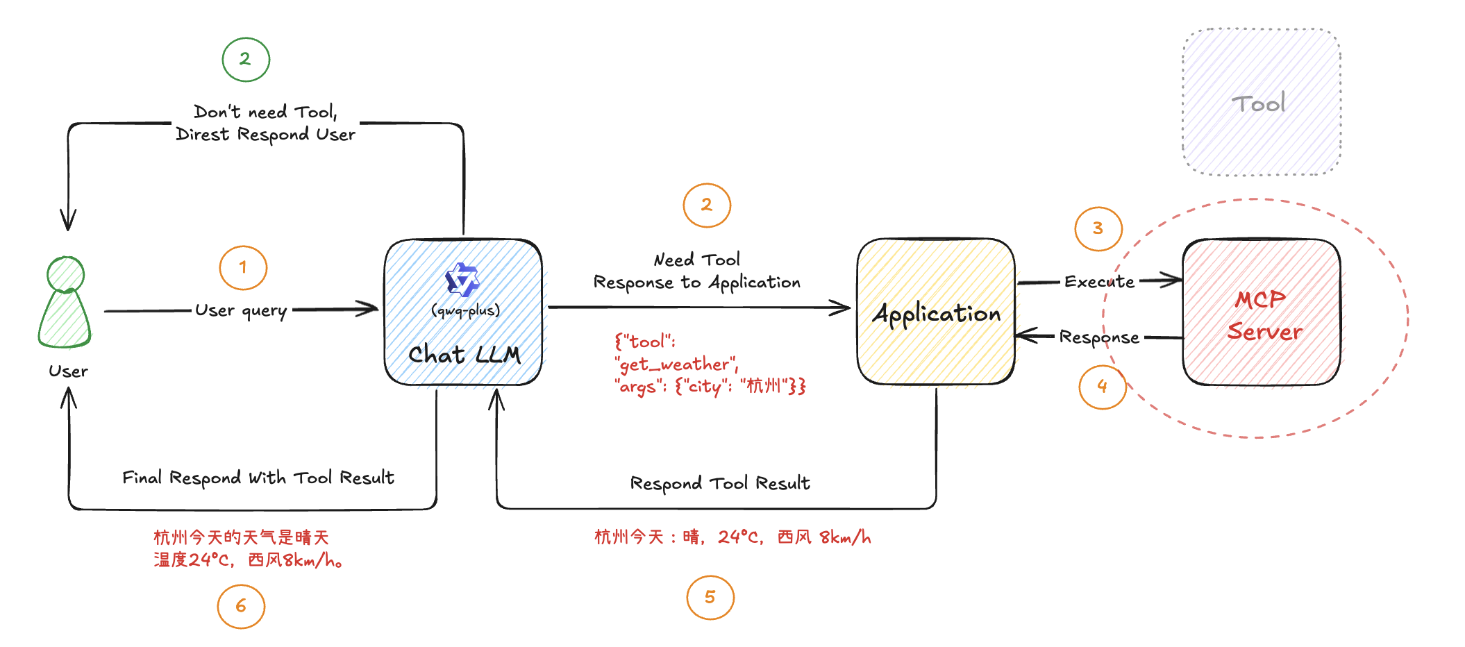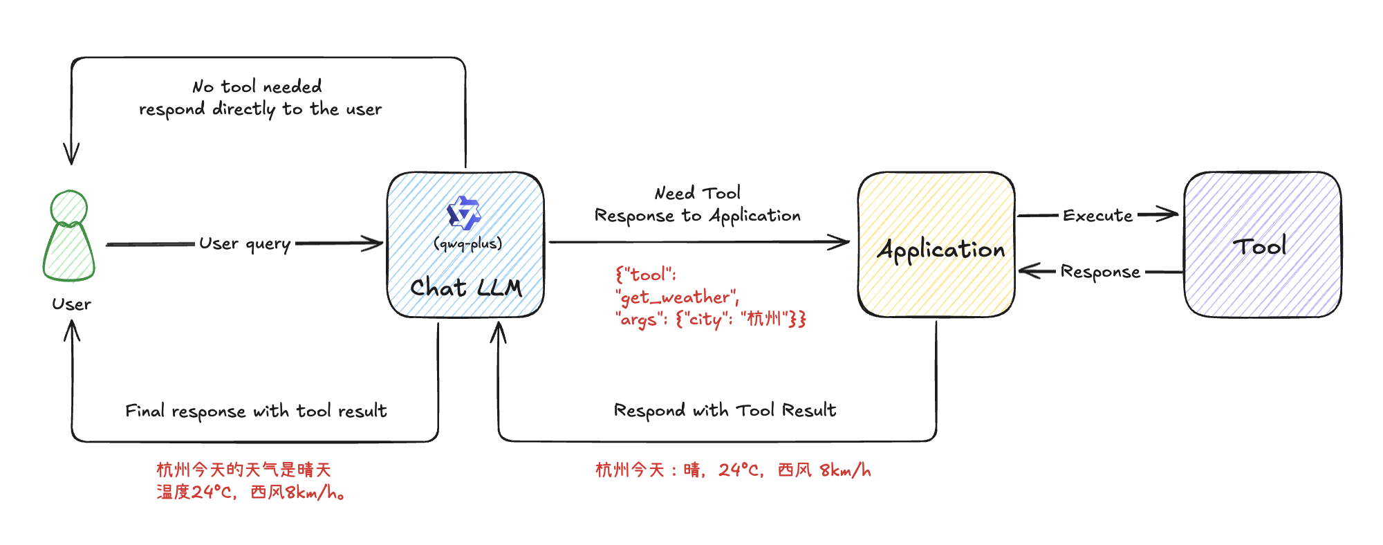 在日常对话中,大模型通常只需返回文字答案。但当用户提出诸如"帮我查一下明天北京的天气"这类超出模型内置知识范围的问题时,就需要借助 Function Calling,即让 AI 调用外部工具来完成任务。