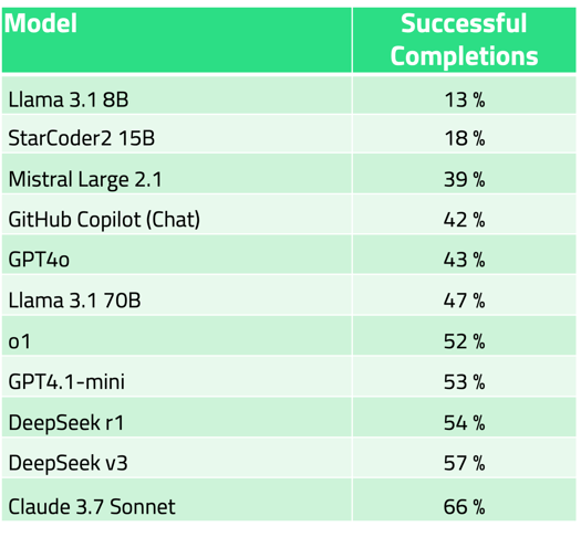 Claude 3.7 Sonnet以66%的成功率稳居提示式代码补全榜首。