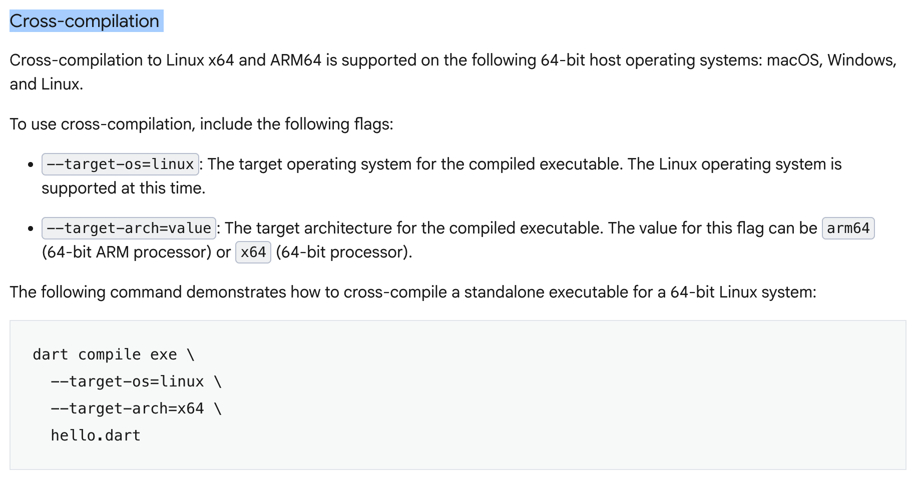 例如 :dart compile exe --target-os=linux --target-arch=x64 hello.dart -o hello