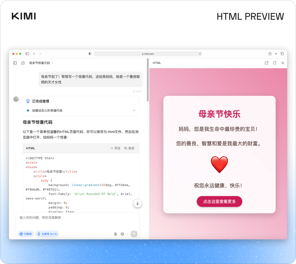 当你想写点网页内容,比如做一张贺卡、搭一个简单页面,或展示一段结构化信息时,Kimi 返回的 HTML 代码现在支持点击预览,方便直接查看样式效果是否符合预期。