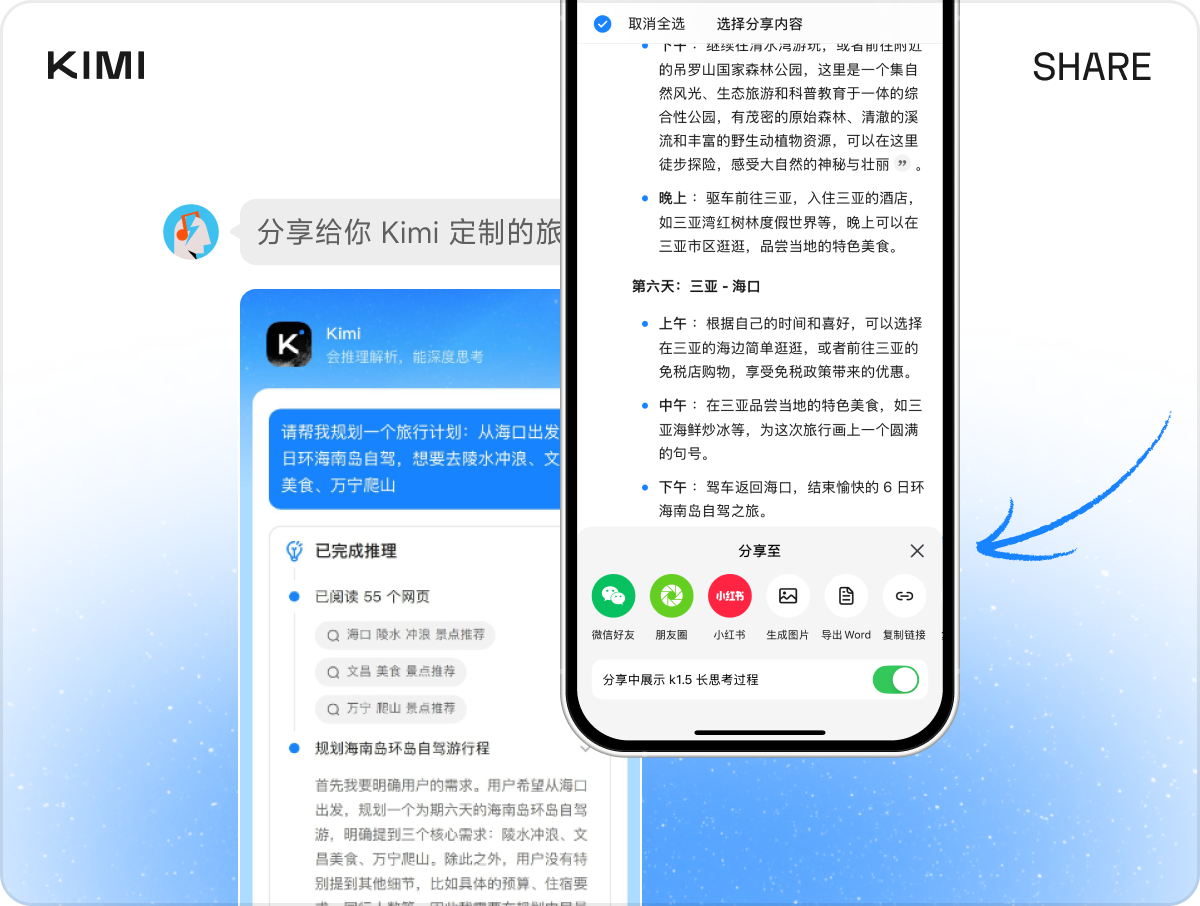 对话内容支持导出为 Word 文件,用于整理素材、准备汇报或保存项目记录。如果启用了 k1.5 思考模型,在导出分享图片时,Kimi 的推理过程也支持一并导出,供你后续参考。