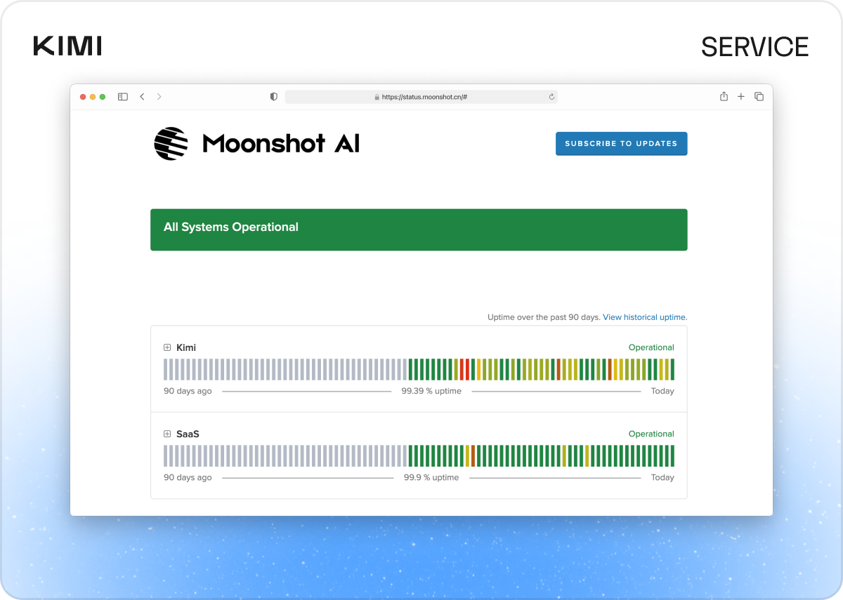 我们近期新增了系统状态查看页面(Status page),支持查看 Kimi 产品及 API 的实时运行情况,包括搜索、文件上传、登录等服务模块。