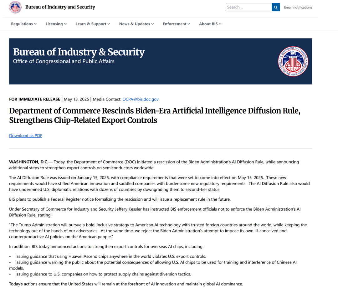 2025年5月13日,美国商务部工业与安全局(BIS)宣布正式撤销拜登政府时期制定的《人工智能扩散规则》(AI Diffusion Rule),并计划进一步强化对全球范围内半导体出口的监管。