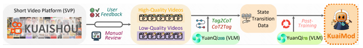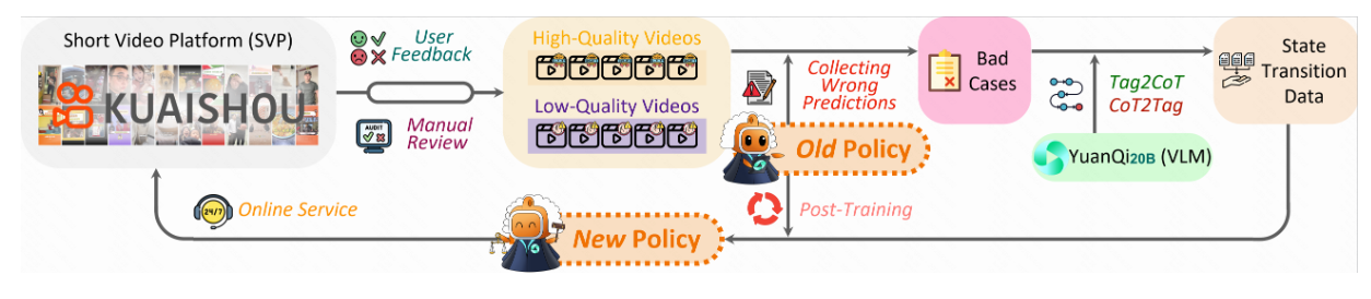 KuaiMod 审核框架由三个部分组成:训练数据构建、离线自适应以及在线部署和改进。快手利用大规模视觉语言模型 (VLM) 和思维链 (CoT) 推理,基于稀疏的用户反馈对视频恶意程度进行充分建模,并构建了更新速度快、准确率高的动态审核策略。