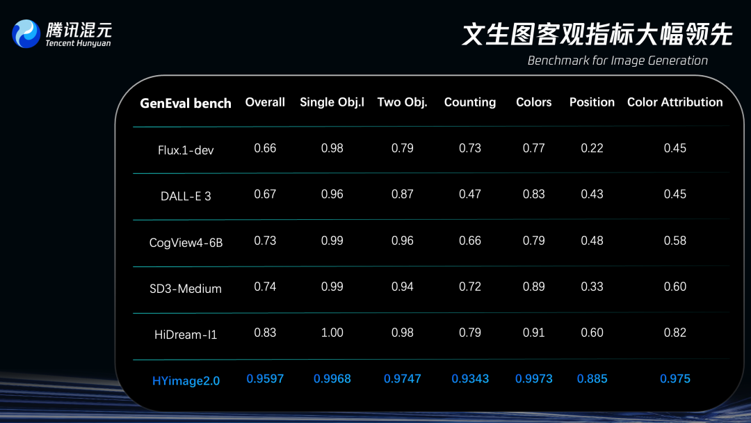 官方数据显示,在图像生成领域专门测试模型复杂文本指令理解与生成能力的评估基准 GenEval(Geneval Bench)上,腾讯混元图像2.0模型准确率超过95%,远超其他同类模型。
