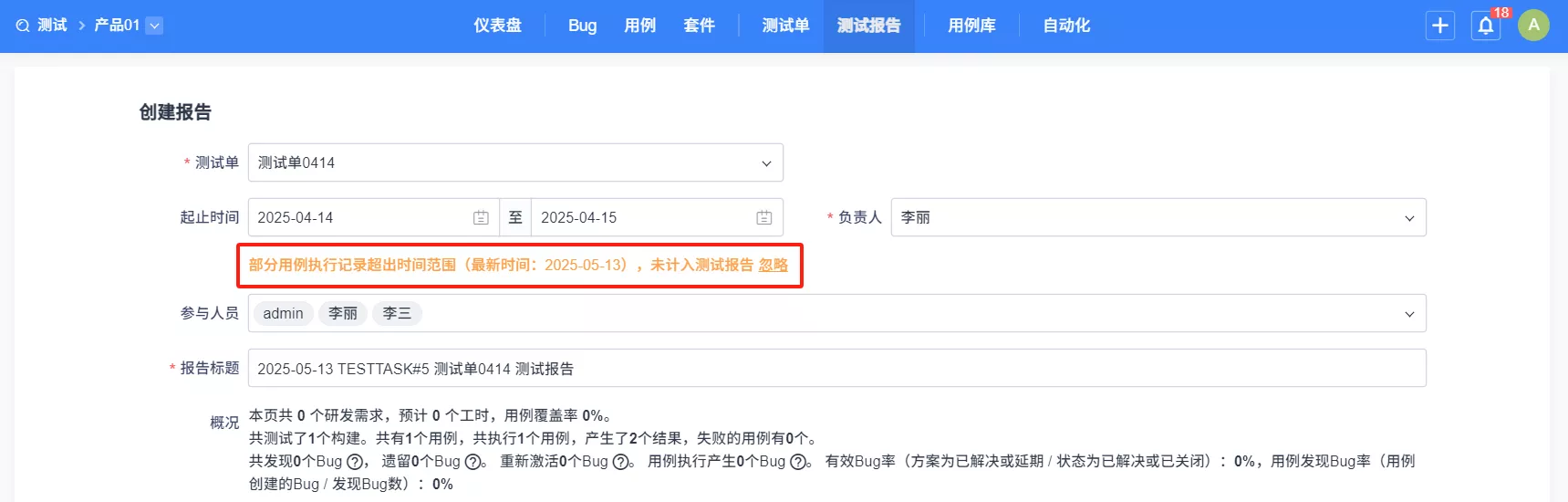 ▼生成测试报告时,如果超过测试单时间仍有执行记录,增加提示。