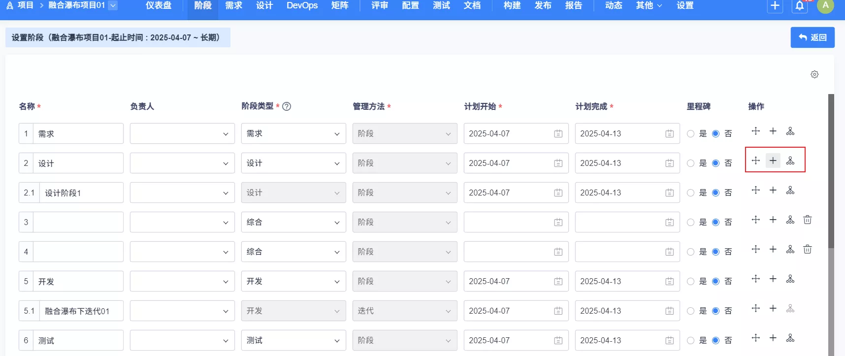 ▼瀑布、融合瀑布支持批量维护父子阶段,节省维护时间,操作更便捷。