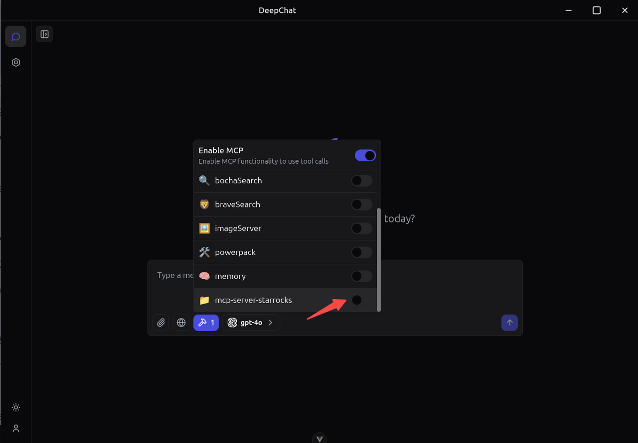 2.1 配置客户端添加 mcp-server-starrocks,客户端使用的是 DeepChat