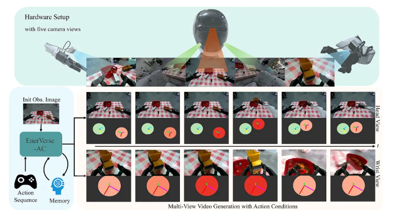 EVAC基于前序工作 EnerVerse 架构持续演进,创新型引入多级动作条件注入机制,实现 “物理动作 - 视觉动态” 的端到端生成,其核心能力体现在以下几个方面: