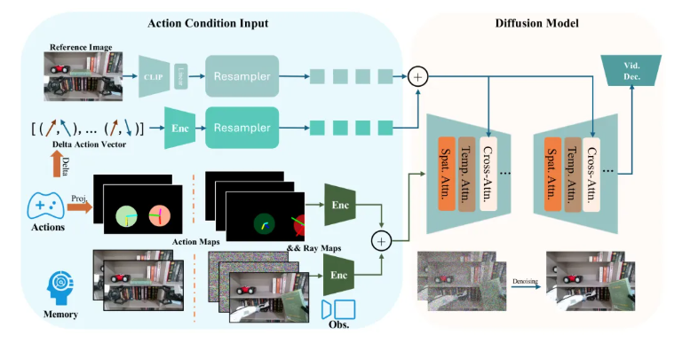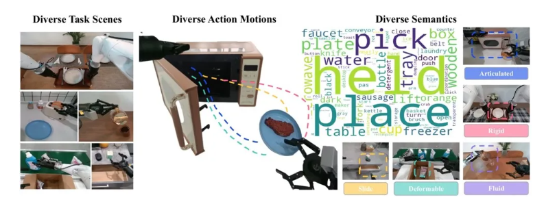 - 机器人动作与像素的高精度对齐:将机械臂 6D 位姿(x,y,z,roll,pitch,yaw)与末端执行器行程投影为action map,确保物理动作与图像帧的像素级对齐,精准建模 “抓取”、“放置”、“碰撞”、“推拉”、“快速抛掷”、“缓慢摇晃” 等复杂动力学行为;