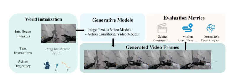 针对机器人操作场景的复杂性与特殊性,EWMBench构建了立体化的评估体系,从场景一致性、动作合理性 与 语义对齐与多样性 三大核心指标进行分析: