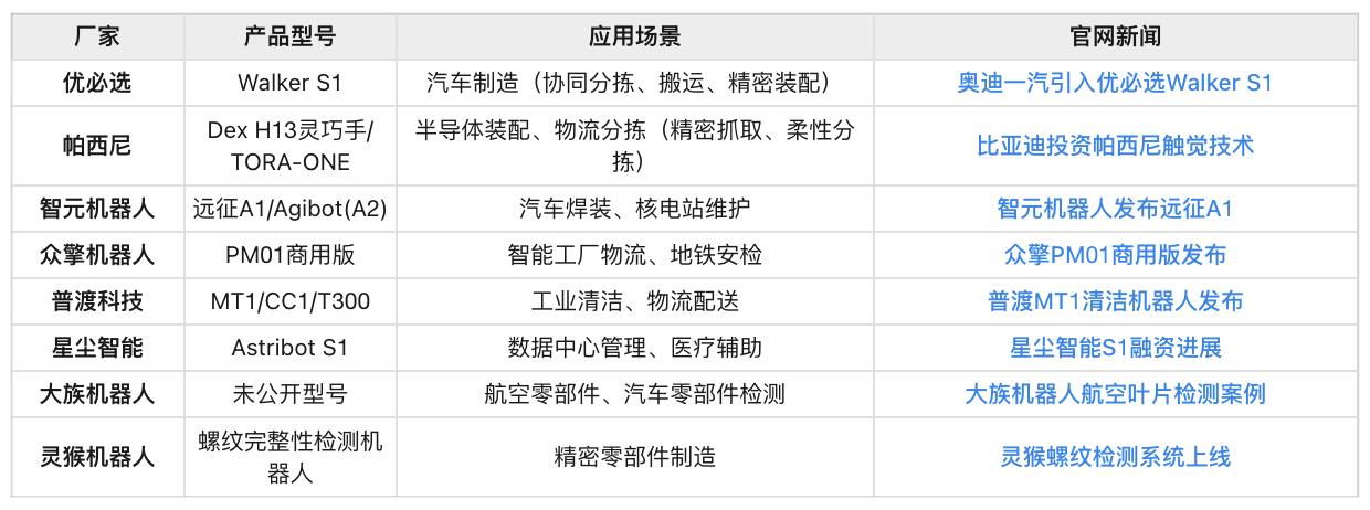 今年以来,也有不少厂商官宣了机器人“进厂”的动态。综合来看,机器人在工业领域的应用主要集中在焊接、搬运、质检、装配四大场景,核心技术包括多模态感知、AI大模型和自适应学习。厂商通过垂直行业需求定制解决方案,推动降本增效。