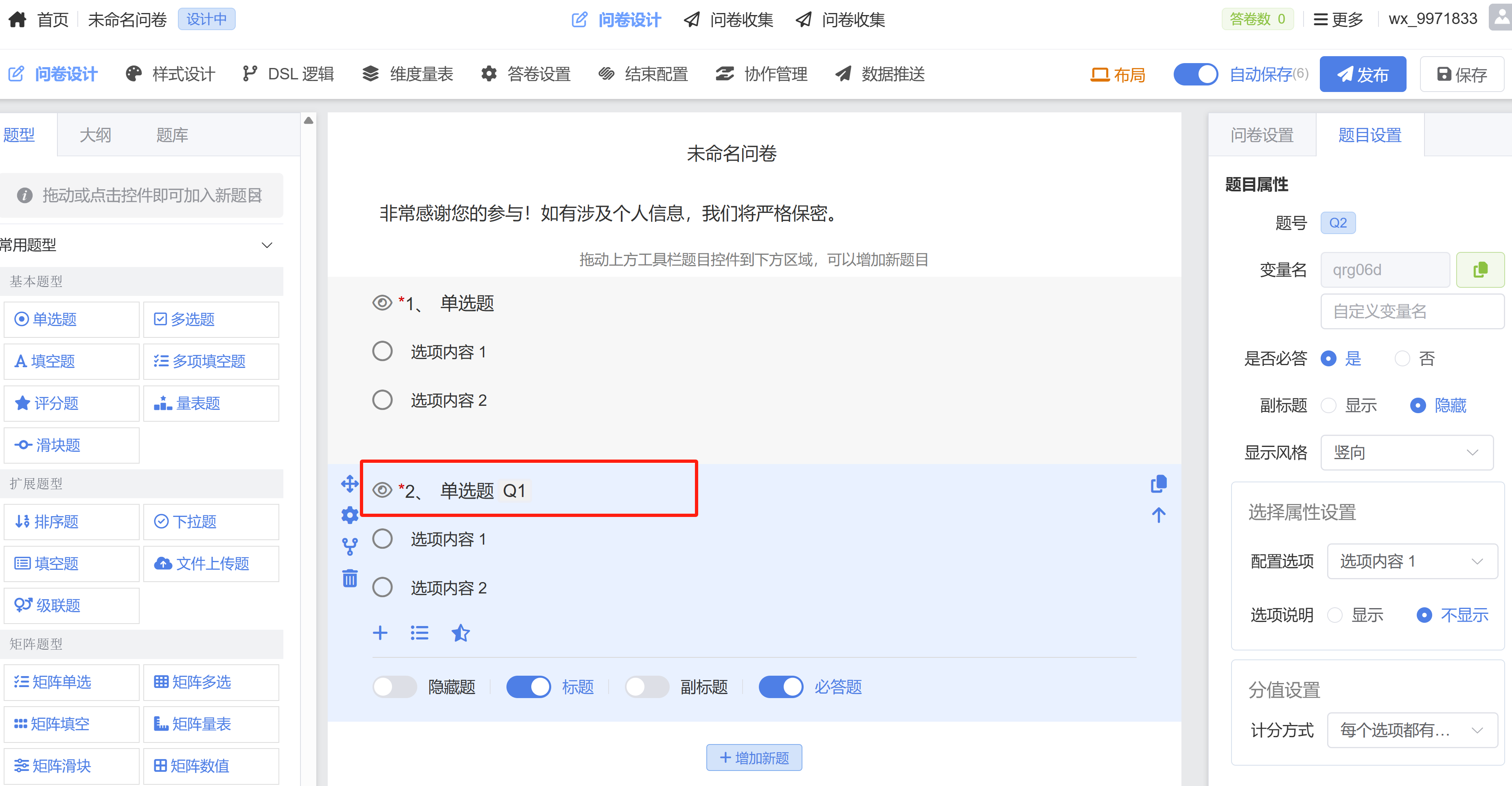 - 优化题目选项属性配置功能,实现点击选项后,右边属性配置区域自动切换到对应的选项配置上;