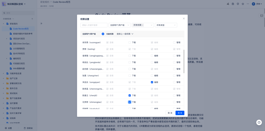 根据场景需求和团队结构定制化管理知识资产,灵活创建组织、团队知识空间;根据分级权限管控及日志管理保障企业知识资产安全,为关键领域软件工厂的知识资产提供了可靠的安全保障。