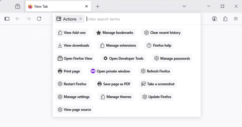 - 可以通过快捷命令 @bookmarks、@tabs、@history 和 @actions 访问不同的搜索模式,可以输入命令执行如“清除历史记录”、“打开下载页”或“截屏”等操作;