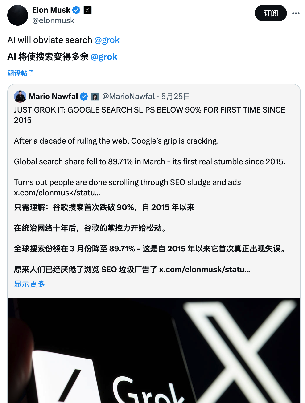 随后,埃隆·马斯克转发了这一观点,并补充道:“AI将取代搜索引擎。”
